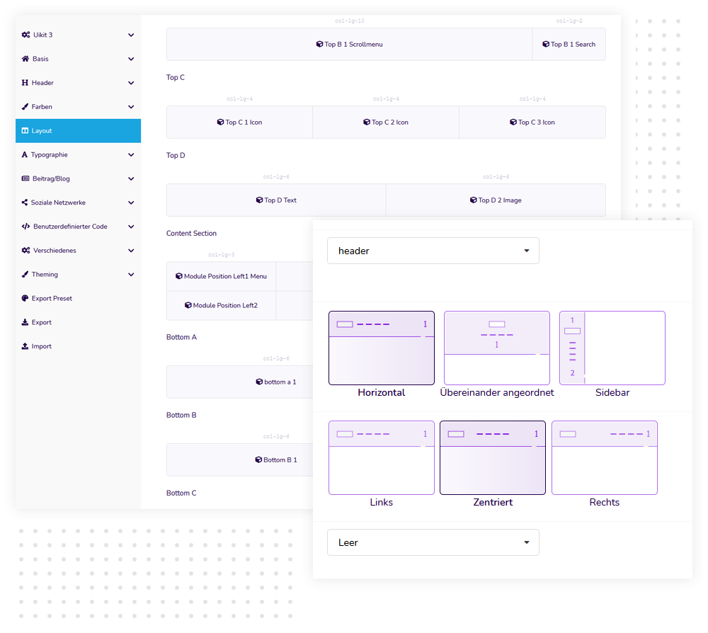 Sie haben mehrere Optionen zur Auswahl und können im Layout Manager problemlos zwischen den Headern wechseln.